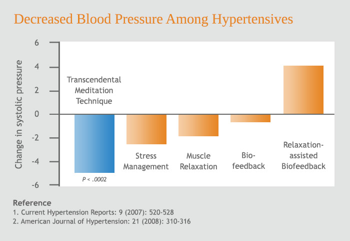 A comprehensive analysis of all published randomised control trials on stress reduction among people with high blood pressure found that Transcendental Meditation was the only technique that did significantly reduce blood pressure. A second analysis replicated the finding that both systolic and diastolic components were significantly reduced by Transcendental Meditation.